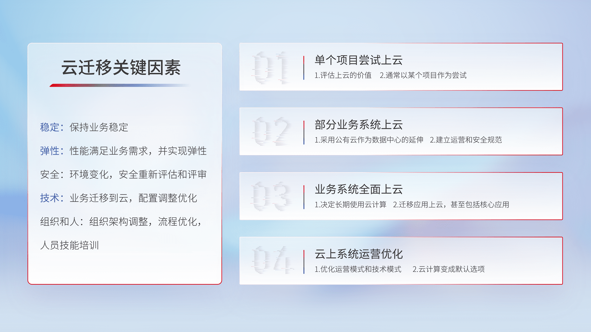 结合实际业务,,,从规划设计、、云平台选型、、、云原生改造、、、、数据迁移、、、、集成交付,,,,迁移全过程为客户识别最佳上云路径,,做好风险识别管理,,设计网络架构、、、身份权限、、安全审计合规、、、操作审计、、日志审计、、监控告警策略、、多站点容灾设计等,,,对云上基础设施进行整体规划,,,,提升IT治理水平,,,以满足弹性、、、、高可用、、、、高性能的需求。。。
